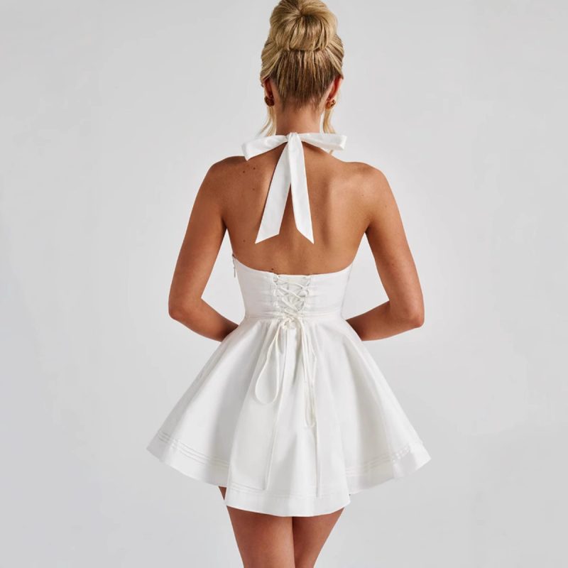 Deep V Halter Dress – Sleeveless Bow Cinched Short